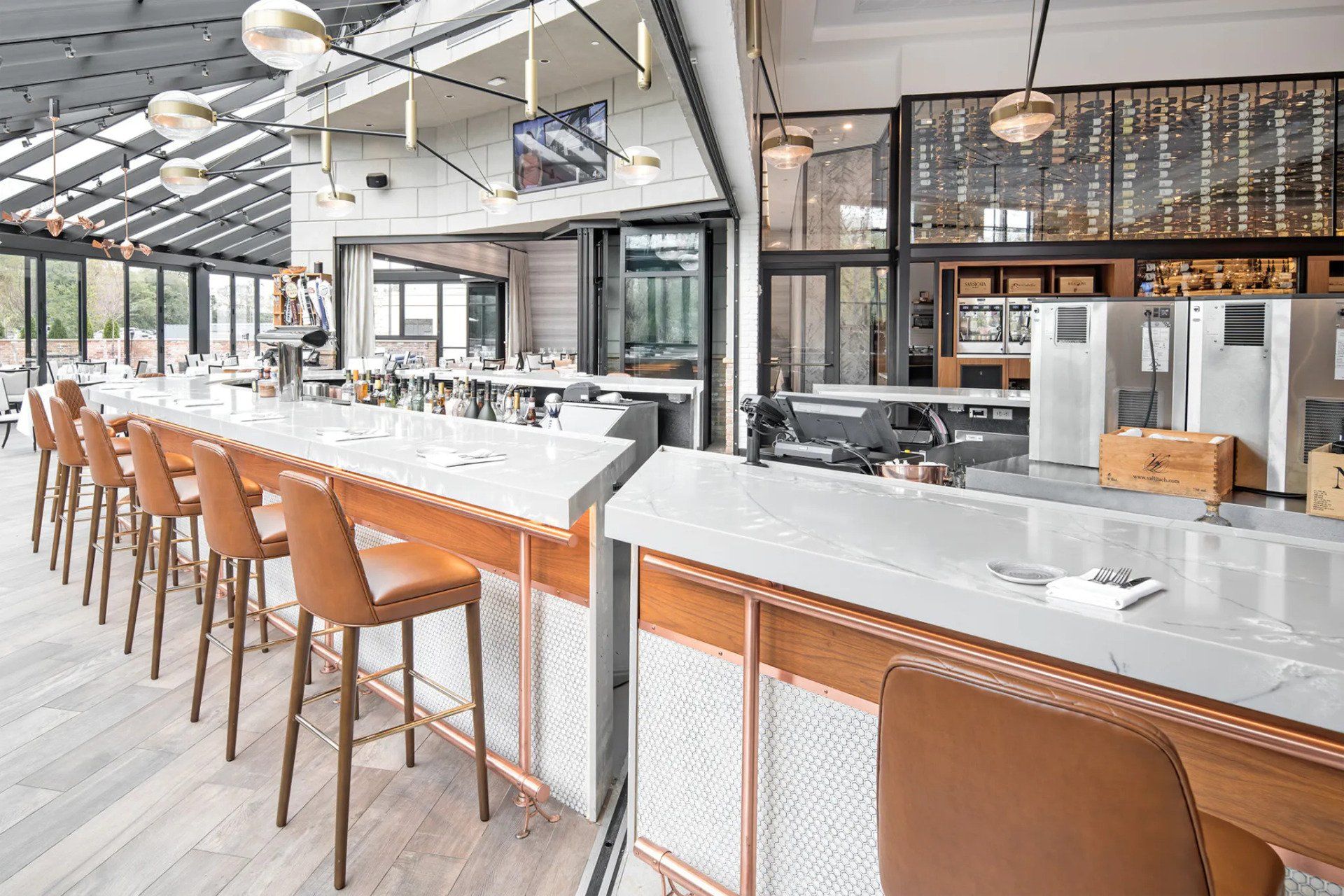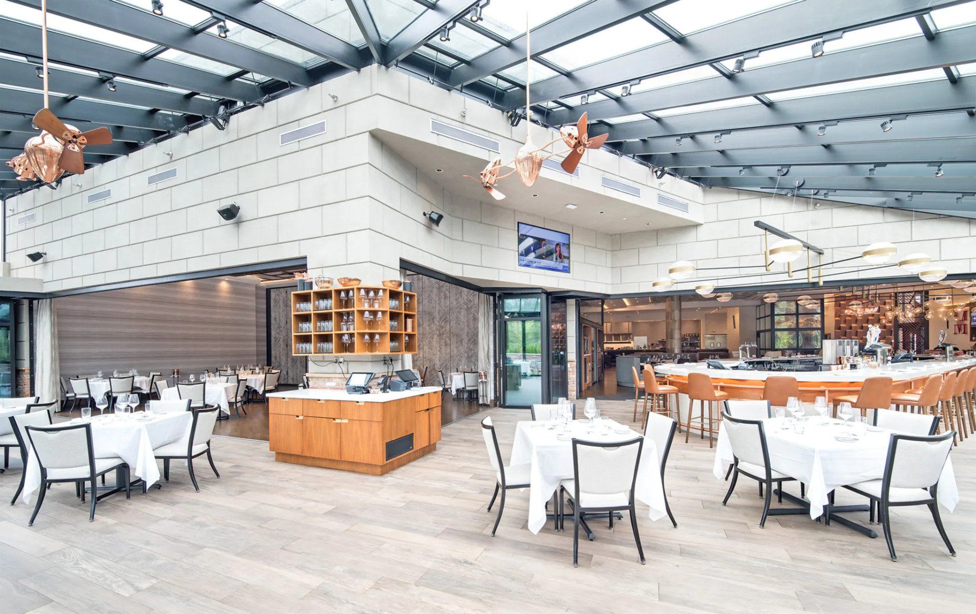 One10 Restaurant in the affluent hamlet of Melville, New York offers its guests an exhilarating dining experience highlighted by modern Italian cuisine and dramatic design features. Co-owner and CFO, Arthur Viana, of Anthony Scotto Restaurants describes the restaurant’s contemporary style as “a hint of an art deco/Jetsons look.” It includes high-vaulted ceilings over large spans with jazzy geometric ceiling tiles, two-story glassed-in wine cellars that look like giant pillars supporting the building, and a color palette of whites, light greys, and blonde wood. But perhaps, the main attraction is the kidney-shaped bar split right in the middle by a NanaWall single track sliding glass wall that transforms the space into two separate barrooms or joins them seamlessly into one.